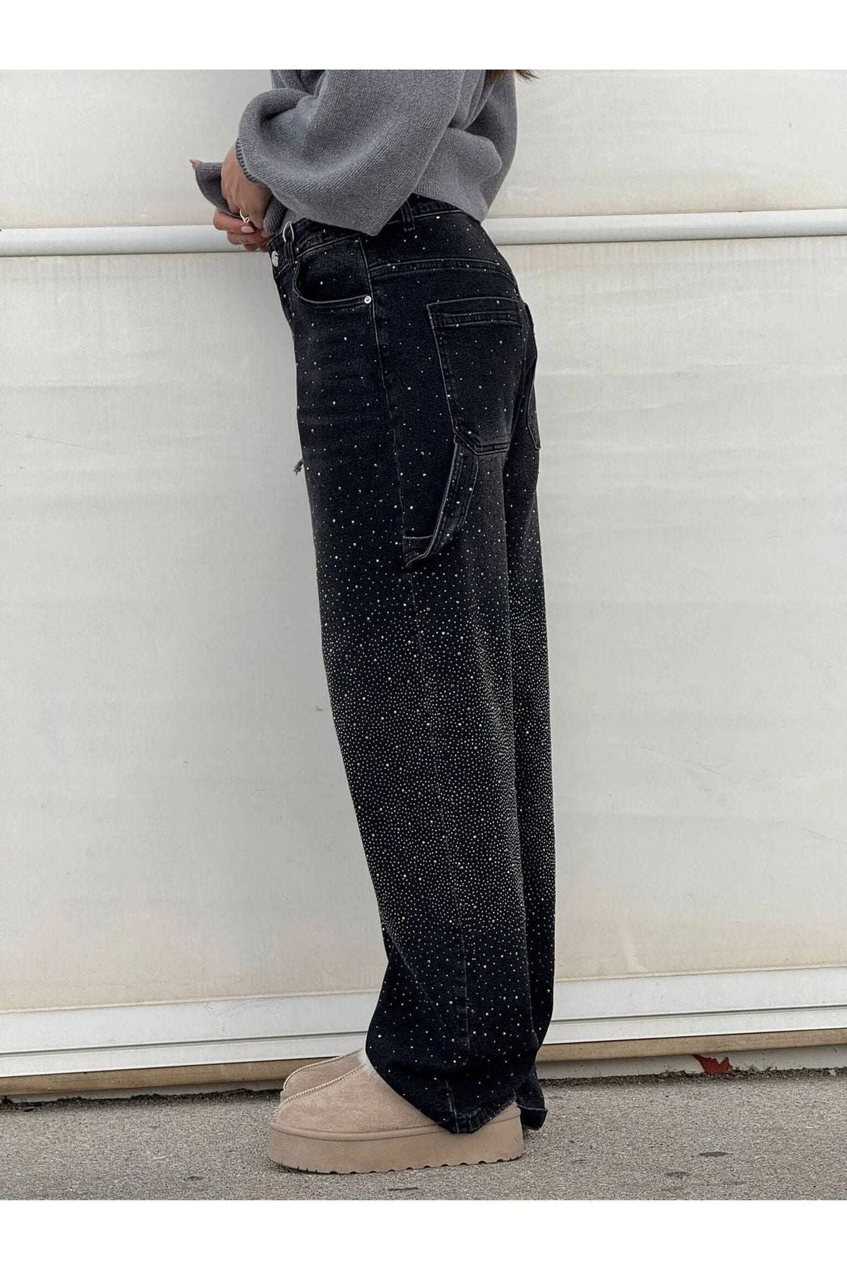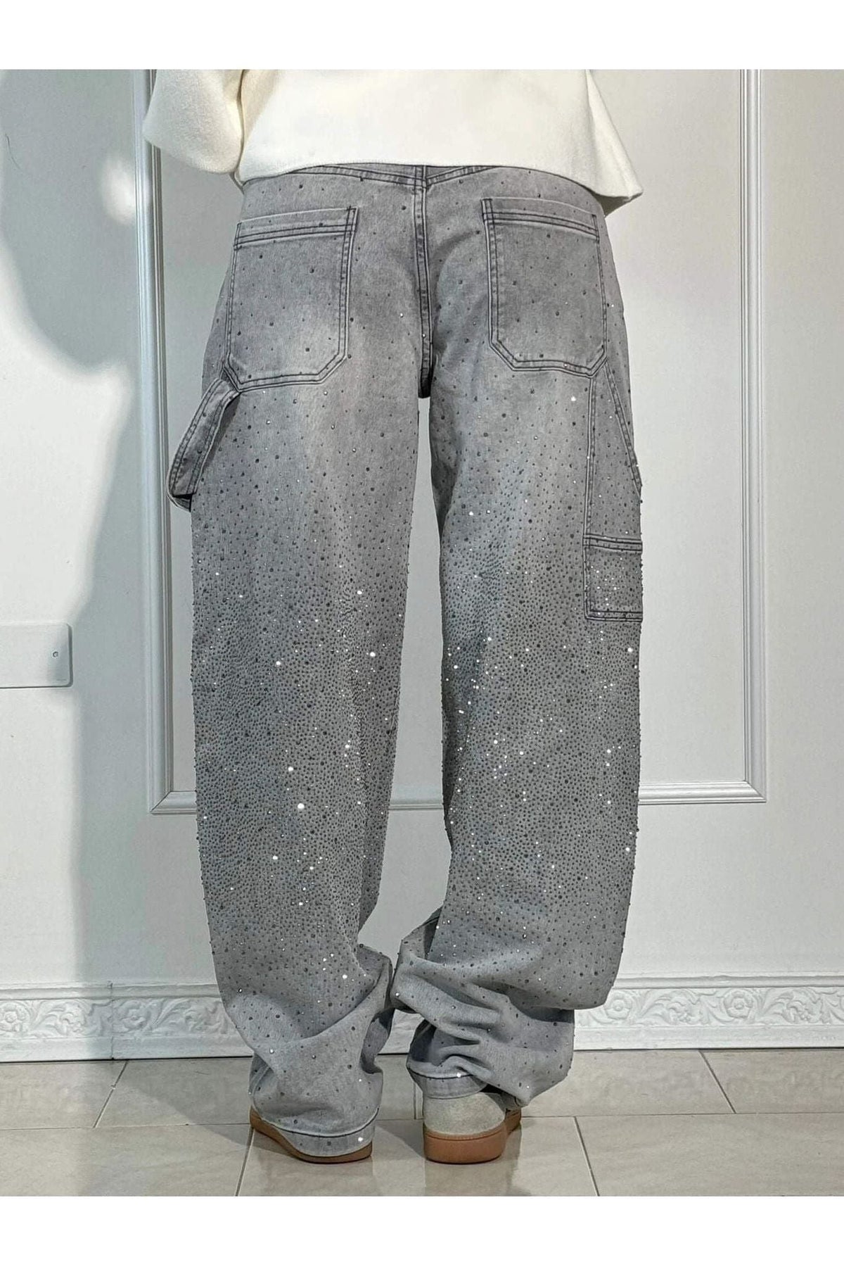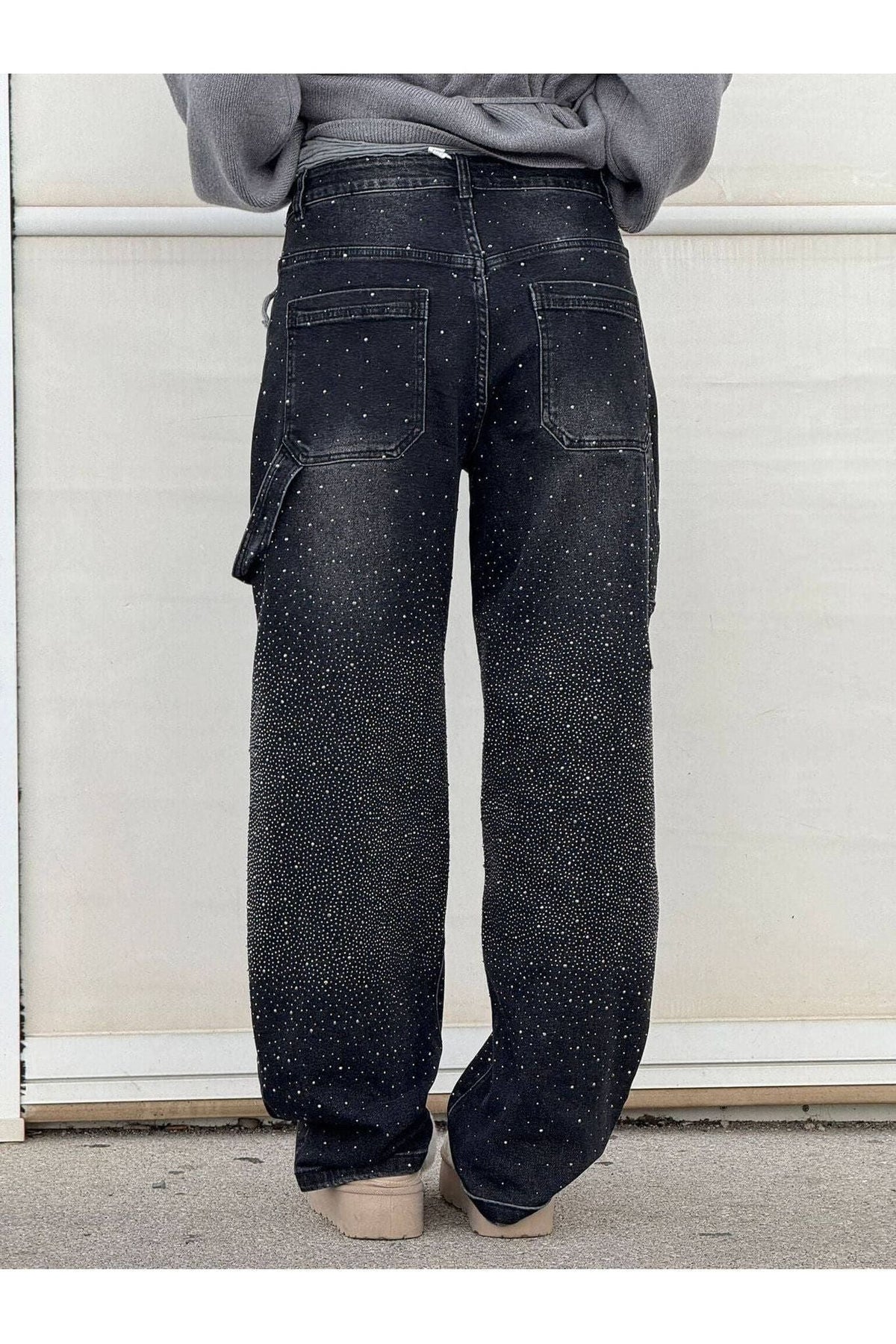With a relaxed wide-leg fit and mid-to-high waist design, these jeans offer both style and comfort. The sparkling rhinestone embellishments catch the light beautifully, making them the perfect statement piece for any occasion.