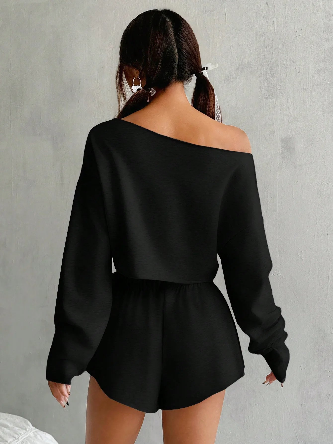 This off-the-shoulder crop and curve-hugging short set is made from ultra-soft, sculpting fabric with just the right amount of stretch. The drape flatters, the fit teases—and the vibe? Effortless, undone, and undeniably sexy.