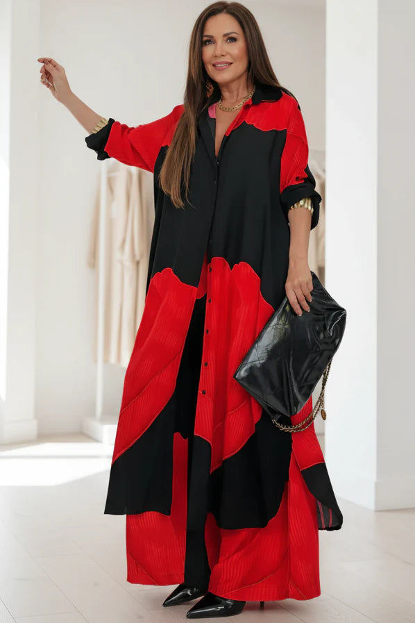 This effortlessly chic two-piece set blends relaxed comfort with standout design. Featuring a flowy button-down top and wide-leg pants with a bold artistic print, it’s the ultimate look for sunny days, brunch dates, or travel-ready fashion that feels as good as it looks.