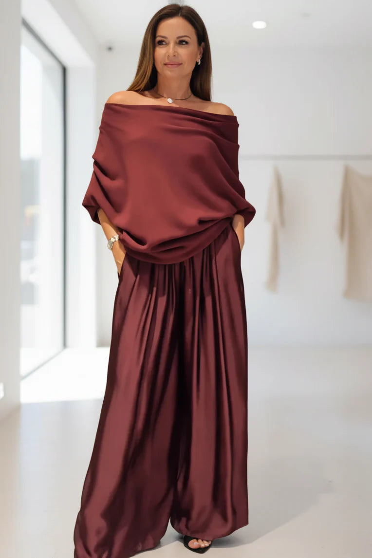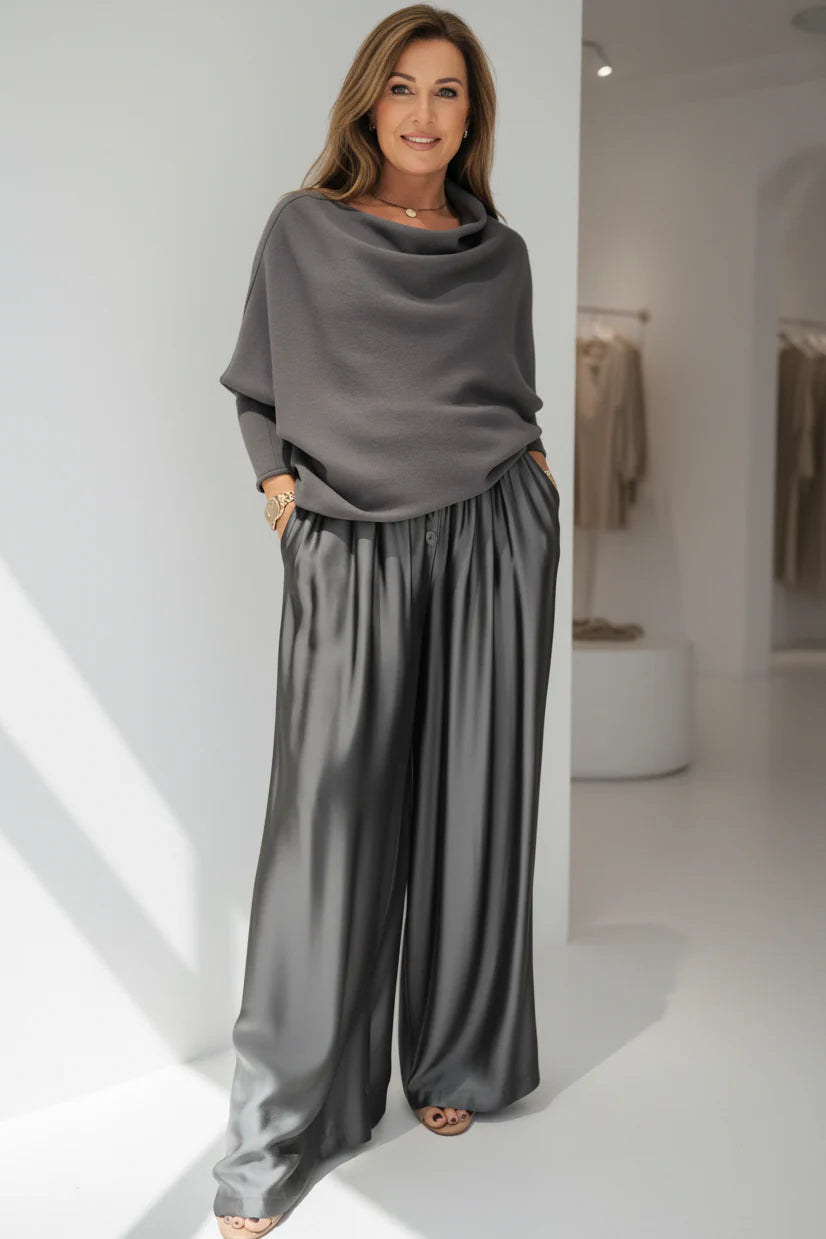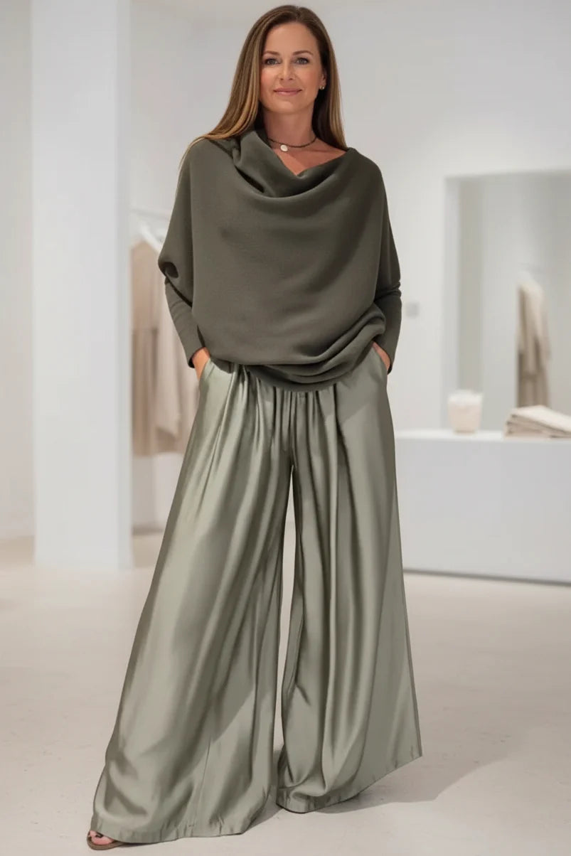 This stunning two-piece set blends soft draping with a beautifully fluid silhouette. The elegant cowl-neck top pairs perfectly with the wide, flowing trousers to create a polished, modern look that feels both comfortable and refined.